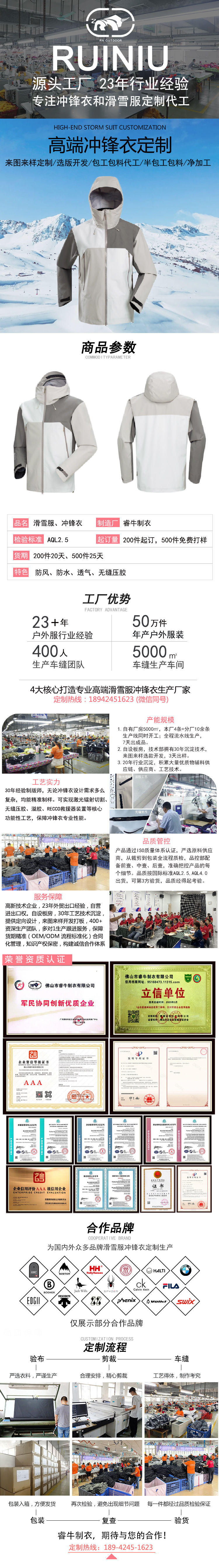 佛山冲锋衣工厂来图来样加工防水压胶冲锋衣